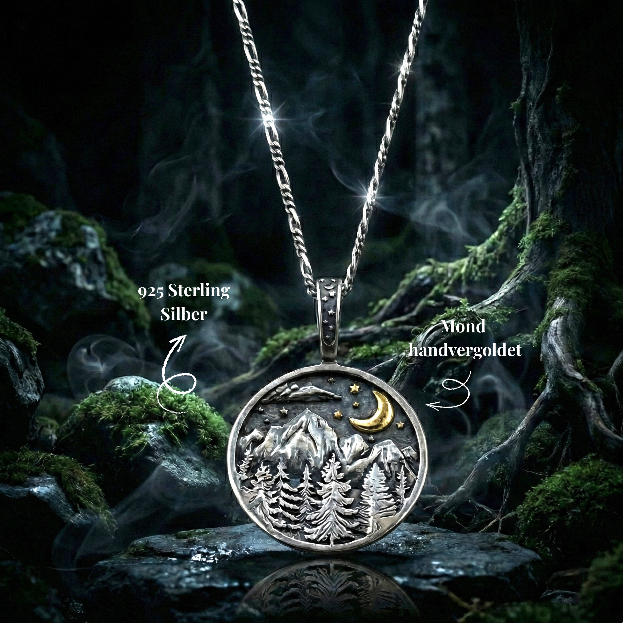 The 925 sterling silver pendant, measuring 2 cm in diameter, depicts a detailed scene with majestic peaks, gentle fir trees, and a graceful night sky with moon and stars, emphasizing the mountain's connection to nature. Each piece is unique and reflects the mysterious beauty of the mountains.