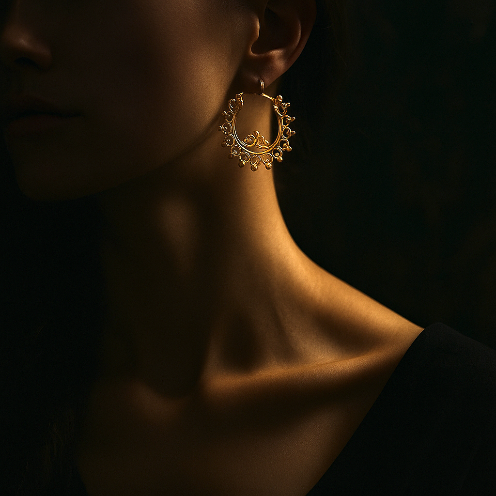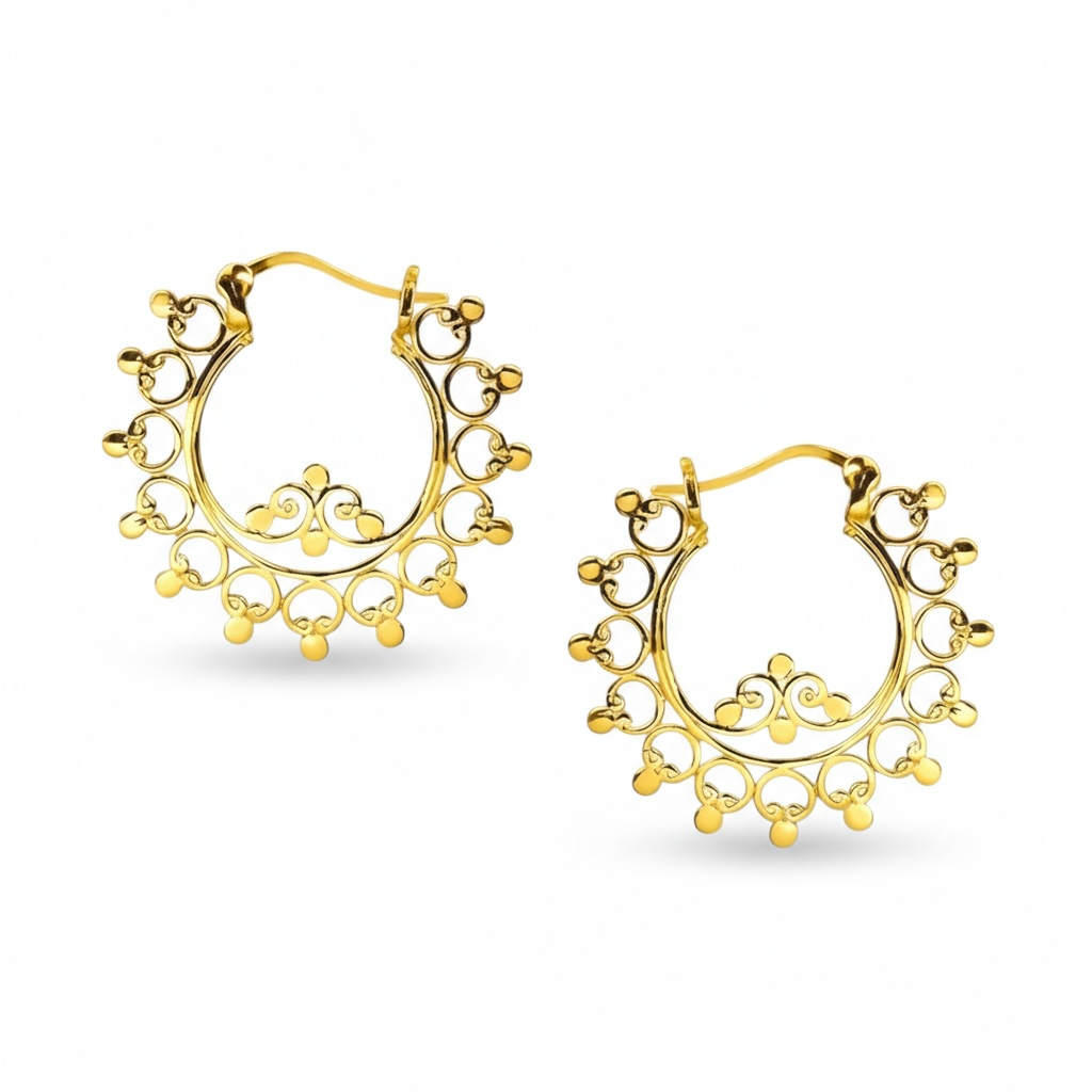 These exotic filigree hoop earrings made of 925 sterling silver with 18K gold plating are the perfect addition to any jewelry collection. With their unique design and high-quality craftsmanship, they are ideal as a stylish accessory for everyday wear or as a special gift for your loved ones. Enjoy the combination of natural beauty and elegant sophistication with our filigree hoop earrings made of 925 sterling silver.