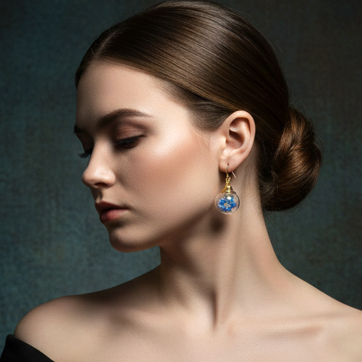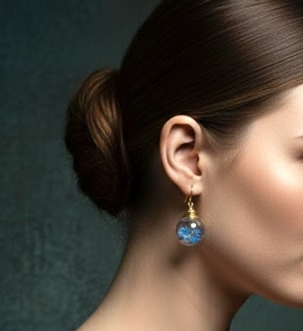 Experience the quintessence of Berlin's natural beauty with these exquisite, handcrafted forget-me-not ball earrings. Each pair is a small work of art, featuring genuine forget-me-not blossoms carefully harvested from our own garden in a clear 1.8 cm diameter ball. With an elegant 3.5 cm drop, these earrings hang gently from the earlobes, offering subtle movement that catches the light and showcases the deep blue tones of the flowers.