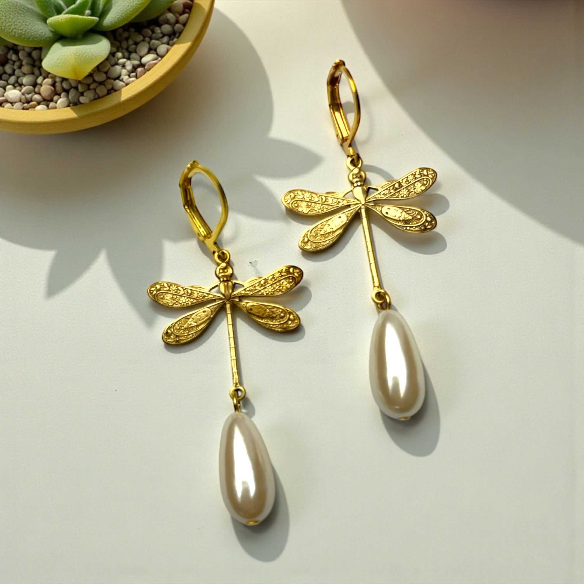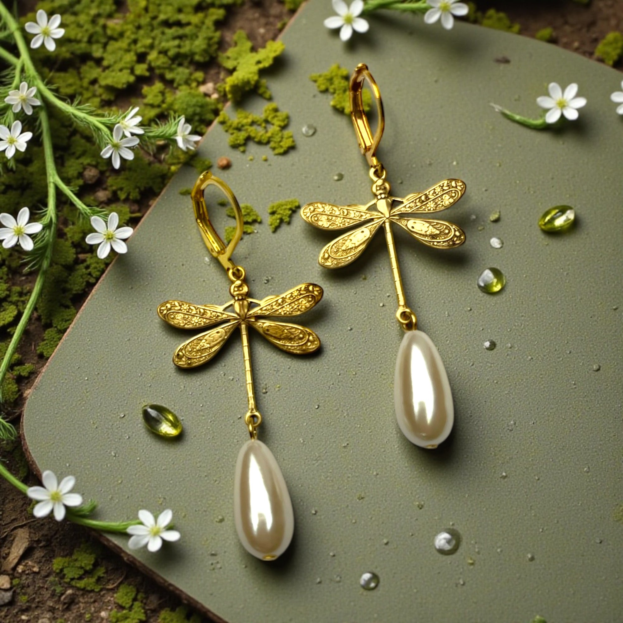 Vergoldete Libellen Ohrringe mit japanischen Tropfenperlen, 3,5 cm, hypoallergen, nickel und bleifrei