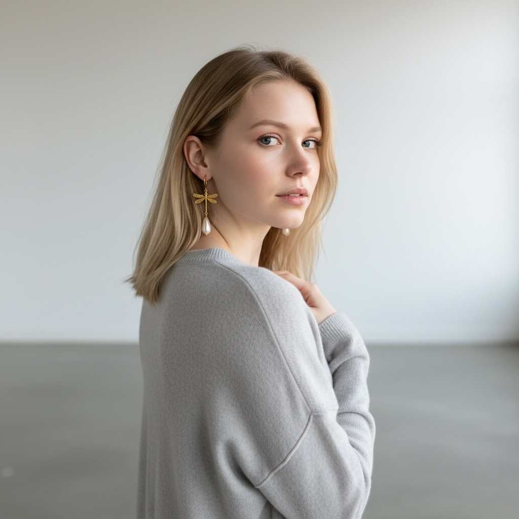 Diese vergoldeten Libellen Ohrringe verbinden feine Leichtigkeit mit hochwertigem Design. Du trägst japanische Tropfenperlen, die für ihre klare Form und gleichmäßige Oberfläche bekannt sind. Die Länge von 3,5 cm sorgt für einen eleganten Fall und ein angenehmes Tragegefühl im Alltag.