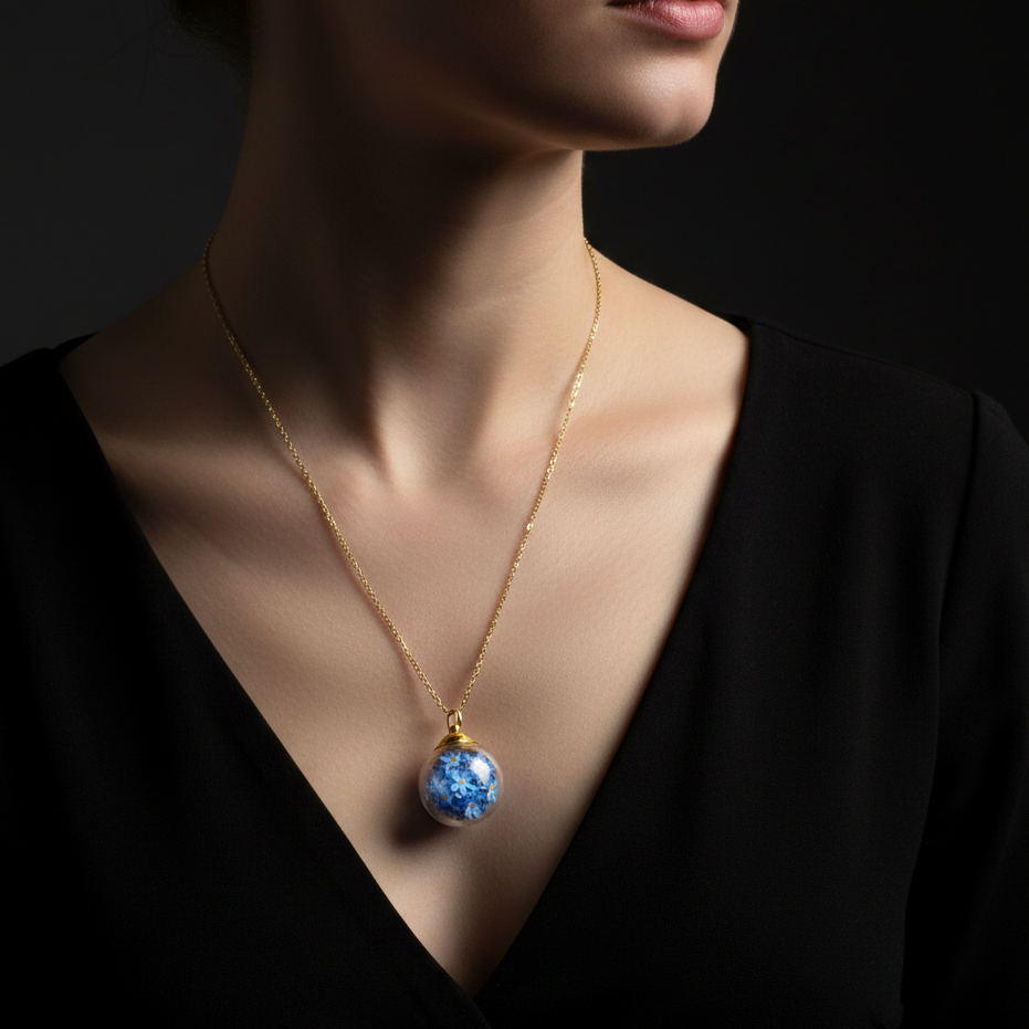 Immerse yourself in the magic of Berlin with our stunning forget-me-not necklace, handcrafted with the utmost care and dedication. This elegant necklace measures 50 cm in length and features a perfectly formed 2 cm sphere filled with delicate forget-me-not blossoms sourced directly from our own garden in Berlin. The flowers are artfully arranged within the sphere, making this piece a true eye-catcher.