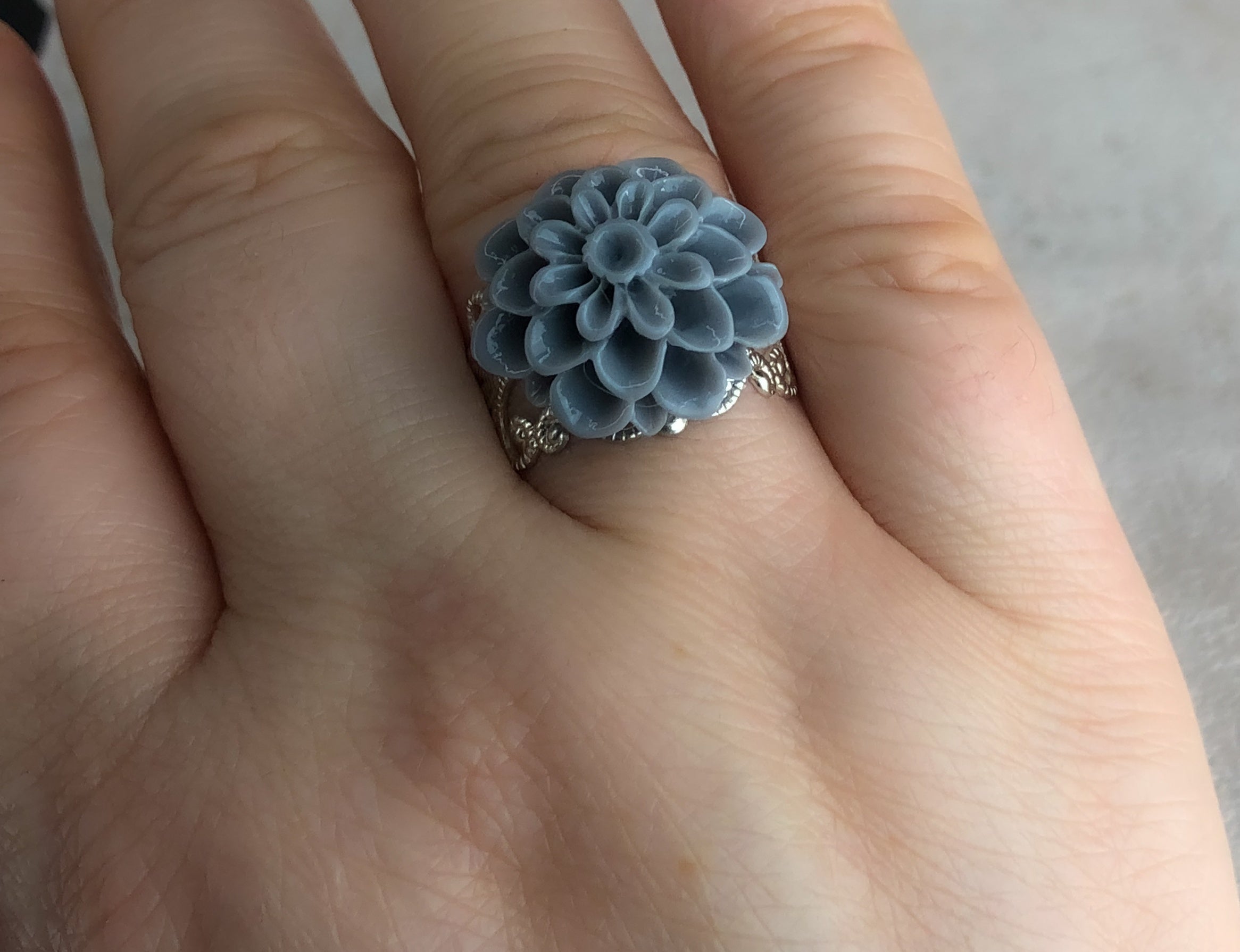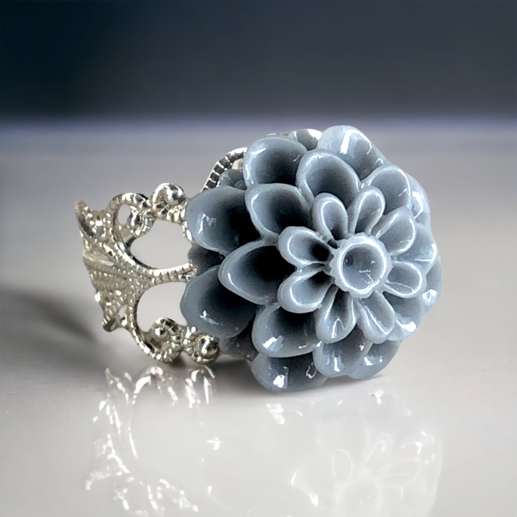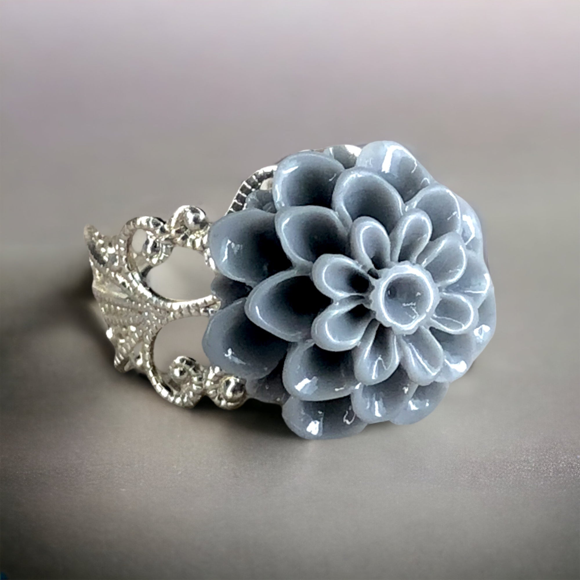 Verleihen Sie Ihrem Outfit einen Hauch von Eleganz mit diesem wunderschönen versilberten Ring mit einem Chrysanthemencabochon in Grau. Der Ring ist größenverstellbar und passt sich perfekt an Ihre Fingergröße an. Der Cabochon hat einen Durchmesser von 18mm und gibt dem Ring ein elegantes und zeitloses Aussehen.